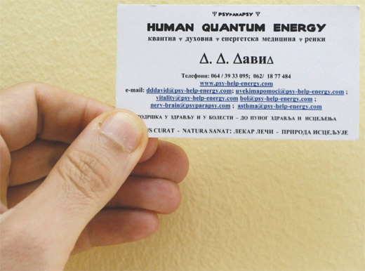 Ranih devedesetih, Sonja Karadžić, guzonjina kći, izdala je album na kome je njeno ime ispisano prepoznatljivim slogom poznatog japanskog proizvođača elektronske robe: SONYA. Ova igra asocijacija između ličnog i korporacijskog imena jasno je uočljiva u dizajnu lične karte Dragana Davida Dabića, na kojoj početna slova imena imaju oblik trougla, odnosno znaka delta, koji je poznat svakom stanovniku Srbije koji je imao ikakva posla u bankama. Vizit karta je pre svega poruka, odnosno predstava. Ona se nikada ne podudara sa ličnošću koju predstavlja: dolazi ili prerano ili prekasno (po-d-setnica ili najavljuje posetioca ili podseća na posetu); obećava ili previše ili premalo. Problem sa porukama je u tome što, kao i svaki označitelj, one sa drugim označiteljima uspostavljaju veze koje mogu biti željene i neželjene, predvidljive i nepredvidljive. Posetnica nije samo poruka, već i ispovest, odnosno povest. Uz to, ne treba zaboraviti da se ovde radi o vizitki jednog pesnika. A kako je ovo književnik koji drži do sebe, takođe ne treba smetnuti s uma da u eri posle Schwittersa i Duchampa svaki iskaz pesnika nosi izvesnu poetsku vrednost. Tako, one tri delte nisu nužno samo inicijali, već se mogu posmatrati kao umetnički i pesnički iskaz, neka vrsta hibrida između haikua i vizualne poezije iz pera majstora ajurvede, joge i ci conga. Ako je malo bliže osmotrimo, ova pesma-slika, odnosno pesma-autoportret i pesma-ispovest pruža začuđujuće koherentnu i velikim delom zapostavljenu sliku geneze novog srpskog nacionalizma. Bizarnost Radovana Karadžića nije se sastojala u krinki iza koje se krio: u socijalnim naočarima, u dobro poznatoj kosmatosti koja je dostigla nove dužine, u rolkama i džemperima koji ističu ranjiv starački trbuščić, pa čak ni u pseudonimičnom prezimenu, koje je u trenutku iznedrilo niz varijacija kao što su dr Daba ili hromi Daba. Prvi deo njegovog alijasa mnogo je običniji od drugog. Zapravo, Dragan zvuči toliko obično da je Karadžić prosto morao da doda još jedno, manje obično ime: David. Ali ma kako se trudio, David ne može da potisne Dragana. Ovaj najneupadljiviji deo Karadžićevog lažnog identiteta zapravo je najrečitiji.